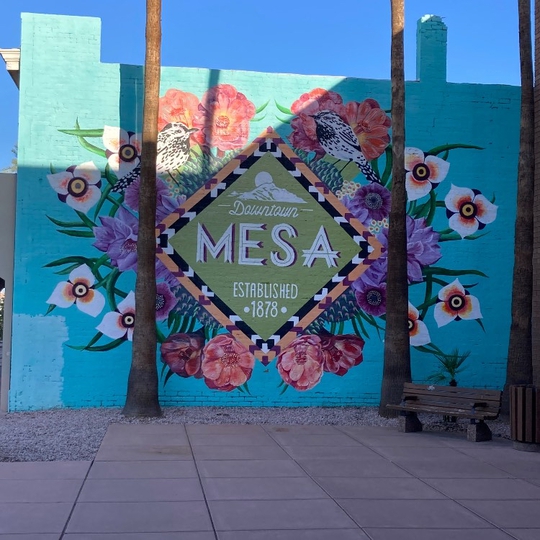 The Downtown Mesa mural on Main Street in Mesa, AZ, is a vibrant and colorful tribute to the city’s history and natural beauty. The mural prominently features the words “Downtown Mesa” with “Established 1878” beneath, honoring the city's founding. Surrounding the text is a rich, floral design with native Arizona flowers and birds, reflecting the region's desert landscape.