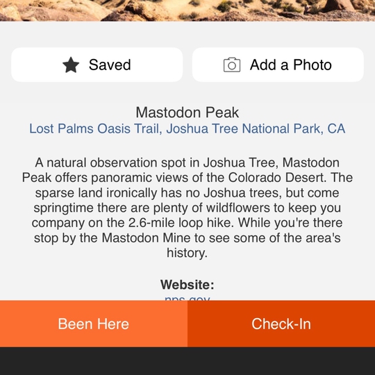 A natural observation spot in Joshua Tree, Mastodon Peak offers panoramic views of the Colorado Desert. The sparse land ironically has no Joshua trees, but come springtime there are plenty of wildflowers to keep you company on the 2.6-mile loop hike. While you're there stop by the Mastodon Mine to see some of the area's history.