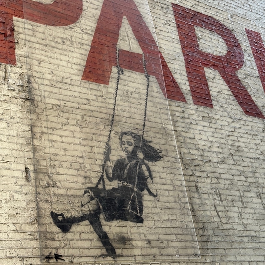 UPDATE: Sadly, some apartment developer built a huge building where this parking lot used to be. Luckily, the Banksy art still exists but now it's sandwiched between two buildings. ----- Another provocative and timely piece by Banksy. This particular piece is situated in an L.A. neighborhood where a group of residents are, indeed, attempting to raise funds to convert a nearby parking lot into a playground.
