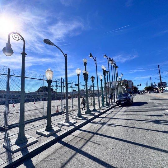 Named for Santa Monica Blvd. and its nearest major crossing street, Vermont, this art installation by Sheila Klein was created in 1993. However, it was moved to its current location in December 2020. It consists of 25 lamp poles, some of which were manufactured in 1925. Klein is noted for her sculptures and public art using mediums such as hand-crocheted and knitted steel. (Submitted by Kimberly Smith)