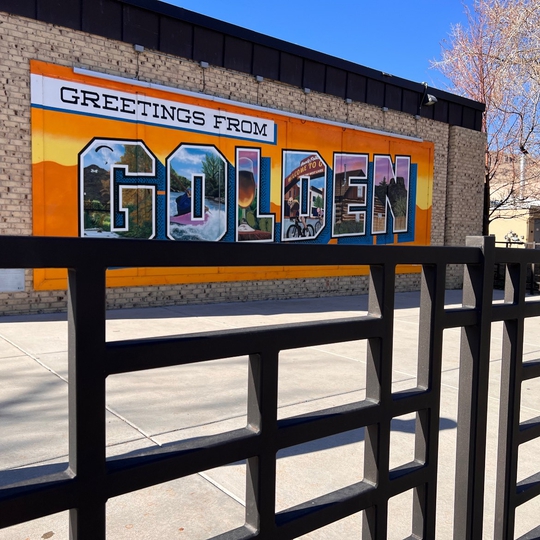The "Greetings From Golden" mural can be found at 923 10th Street in Golden. This vibrant 8' H x 24' W mural was crafted by the talented artist duo, Victor Ving and photographer Lisa Beggs, collectively known as the "Greetings Tour." With a remarkable portfolio that boasts over 60 murals across more than 25 states, this artistic couple remains dedicated to their goal of bringing their captivating postcard-style murals to all 50 states across the United States.