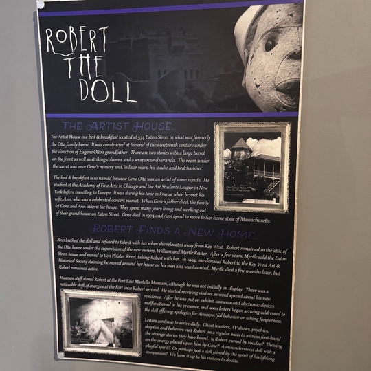 Robert the Doll is a rather infamous exhibit at the Fort East Martello Museum in Key West. The doll, standing 3 feet tall, is said to be haunted and cursed and is believed to have caused numerous misfortunes to those who have interacted with it. The doll was originally owned by a young boy named Robert Eugene Otto who received it as a gift from his family's Bahamian servant in the early 1900s. Robert became very attached to the doll and would often talk to it as if it were alive, leading some to believe that the doll was possessed. Over time strange occurrences began to happen in the Otto household. Furniture would move on its own, disembodied voices could be heard, and neighbors reported seeing the doll move from window to window when the family was out of the house. It's said that Robert would blame the doll for these incidents, claiming that it would move on its own and even attack him in his sleep.