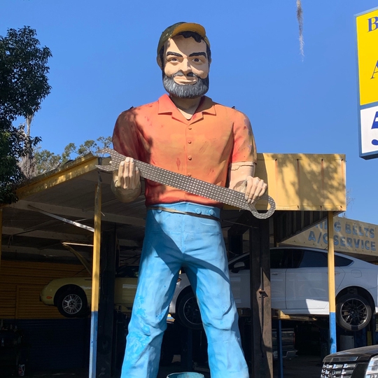 Auto Air Muffler & Brake City has a muffler man (who at one time was Paul Bunyan.) His wool hat was replaced with a baseball cap and he now holds a wrench instead of an ax.