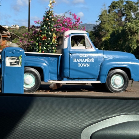A vintage hot rod truck complete with painted flames shows off its softer side with a flower garden in its trunk. This little patch of bougainvillea is located on the main street of Hanapepe which means there is plenty to eating, shopping, and exploring!