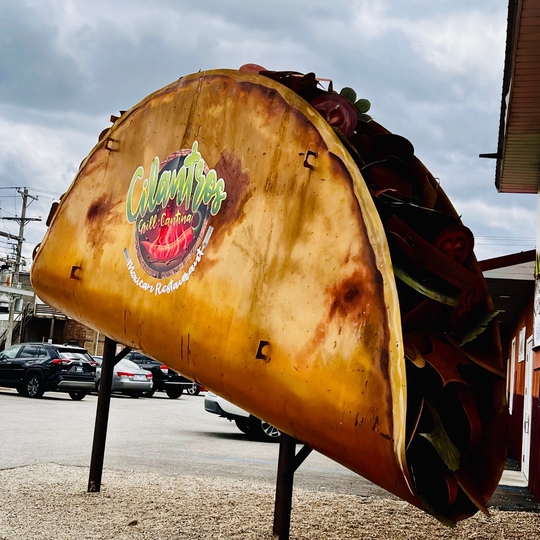 The giant taco sculpture known as the Big Taco in Casey, Illinois measures 16 feet long, 7.5 feet wide and weighs about 3,500 pounds. It was created by a Mexican firm named JalCraft and installed in 2021 outside the Mexican restaurant Cilantros Grill & Cantina at 25 NW 1st St. as part of the town’s whimsical “big things” attraction trail.