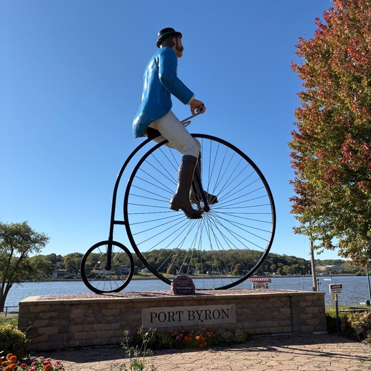 Will B. Rolling is a statue of man wearing a porkpie hat, riding a penny-farthing bicycle along the Mississippi River. The fiberglass cyclist isn't the only thing to see here, though. Port Byron is a picturesque riverside village, a great stop on the way to Davenport, IA.