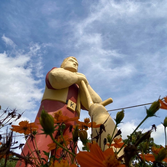 This giant Johnny Kaw is made of cement poured over a steel skeleton and has withstood Kansas weather since 1966. Mr. Kaw is a mythical Kansas settler of god-like attributes - creating the landscape and scenery of this state in the Midwest. He holds a giant scythe which apparently he needed to dig the Kansas River Valley and hack off the funnels of tornadoes.