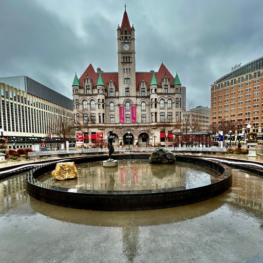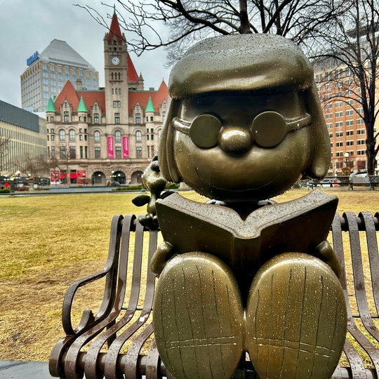 Landmark Plaza enhances downtown Saint Paul with its lush green lawns and picturesque trees. It links Hamm Memorial Park and Rice Park and features several bronze statues of Peanuts characters.