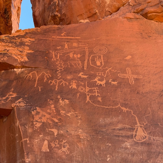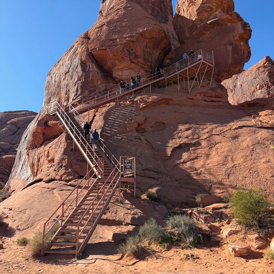 Atlatl Rock in Valley of Fire State Park is famous for its well-preserved petroglyphs, some dating back more than 2,000 years. Visitors can climb a short staircase to view the ancient rock carvings up close, including depictions of hunters and the atlatl, a prehistoric spear-throwing tool. The site offers a fascinating glimpse into the lives and artistry of the region’s early inhabitants.