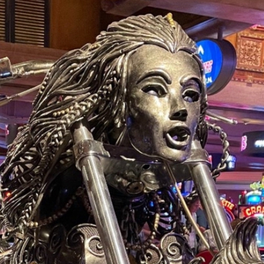 This 900-lb sculpture masterpiece was created with scrap metal and parts. Metal artist, Scott Cawood, spent six months transforming 250 pounds of iron and steel into a work of art for Treasure Island Casino's "Sirens of TI" show. The breathtaking bike features a figurehead of a terrifyingly beautiful siren with spellbinding blue eyes, evoking the mythological creature perfectly.
