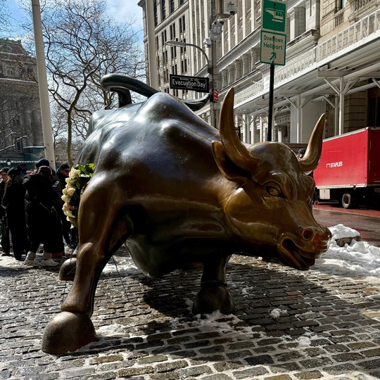 A symbol of American prosperity and optimism, this bronze charging bull has been a fixture on Wall Street since 1987 when artist Arturo Di Modica placed it there proactively. Perhaps Di Modica's actions, which were not authorized by the city of New York, were also a symbol of the individualist spirit that is a trademark of the U.S. The intact bovine is a tourist attraction for millions around the world who flock to its location to take pictures - especially near its back end.