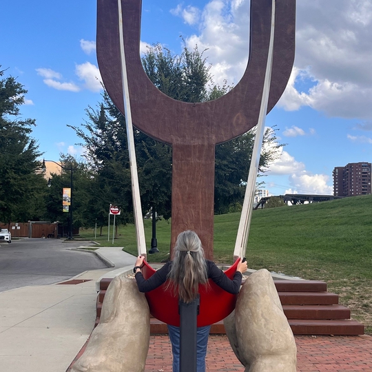 The Slingshot is a striking 20-foot-tall, 12-foot-wide kinetic sculpture located in the Franklinton neighborhood of Columbus, Ohio. Designed by local artist Andrew Lundberg and unveiled in 2022, the piece features a stretched rubber band held by two giant fingers emerging from the ground, symbolizing the community's momentum and playful spirit . Visitors are encouraged to interact with the sculpture by stepping into its oversized pouch, making it a popular spot for photos and a testament to Franklinton's vibrant arts scene.