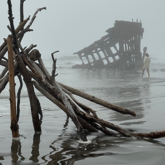 All that remains of the grand, four-masted barque "Peter Iredale" is a rusted bow. It juts out of the water, a skeleton that looks like the bony remains of a great whale or shark. It's the perfect setting at sundown where the ship's carcass makes an eerily beautiful silhouette against the backdrop of a fiery sky.