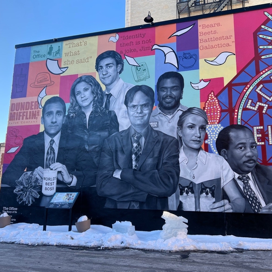"The Office: The Story of Us" mural by Hagopian Arts is a project of Scranton Tomorrow, supported by Universal Television and Peacock, with the Lackawanna County Visitors Bureau as the premier sponsor. This mural is the fourth in a series of public artworks created through Scranton Tomorrow's Mural Arts Program. It serves as a tribute to "The Office," NBCs hit comedy series set in Scranton, Pennsylvania, which aired from 2005 to 2013.