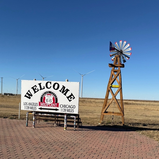 1,139 miles to Chicago and 1,139 miles to Los Angeles - Adrian, Texas is generally considered the midpoint state on the historic Route 66. The town itself has less than 200 permanent residents, but Route 66's old glamour allure brings in thousands of visitors annually from all over the world.