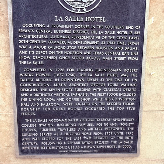 The LaSalle Hotel in Bryan, Texas opened in 1928 as a seven-story landmark and was the tallest building in the city, built to serve travelers from the nearby railroad and anchored downtown’s commercial district. Over the decades it housed guest rooms, a ballroom and shops, later became a nursing home and apartment building, and sat vacant for many years before a restoration effort led to its reopening as a boutique hotel in 2000 and its listing on the National Register of Historic Places. Today, after further renovations and inclusion in the Marriott Tribute Portfolio, the historic LaSalle continues to blend its original charm with modern amenities in the heart of downtown Bryan.