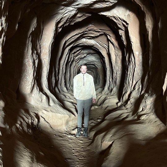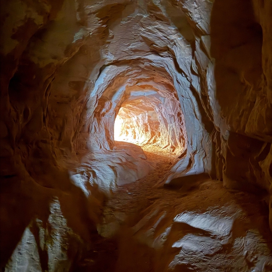 A long and dark cylindrical entrance with segmented rings like a giant trachea seems to go straight into the bowels of a great beast. The reality is a lot less interesting which belies its spectacular appearance. It's a manmade drainage tunnel, but the soft sandstone bottom had been eroded away by a constant flow of water. To get there take Hwy 89 to Twin Hollows Campground. Drive about 1/4 of a mile and you'll see a small dirt parking area on the left-hand side. The trail to the tunnel also starts here.