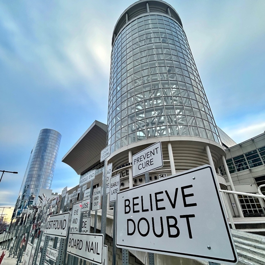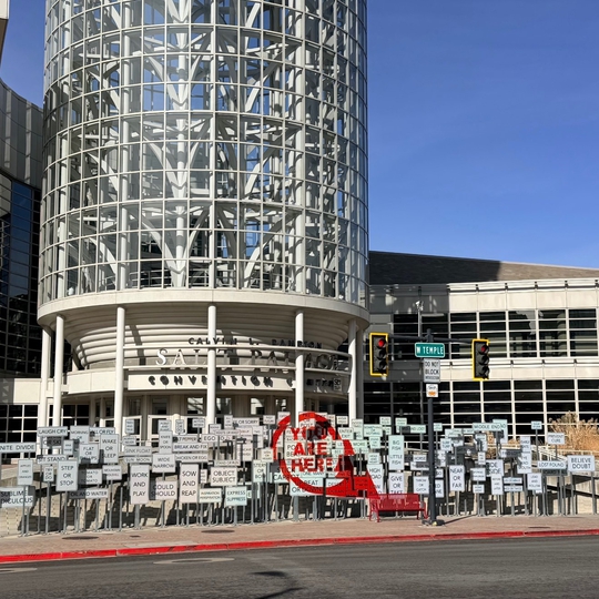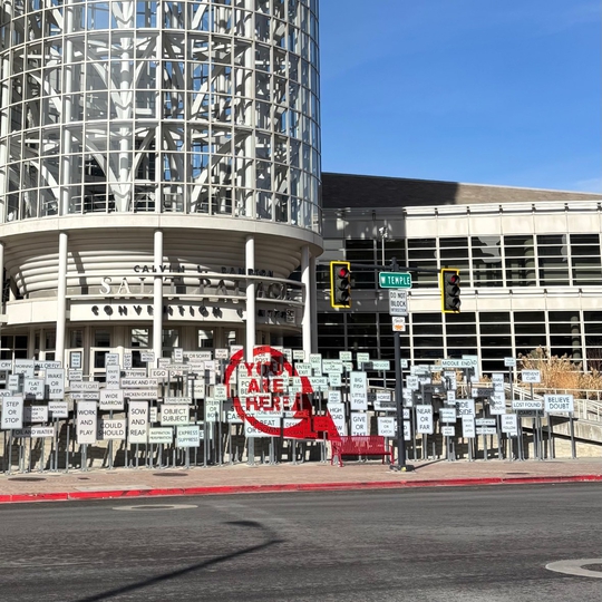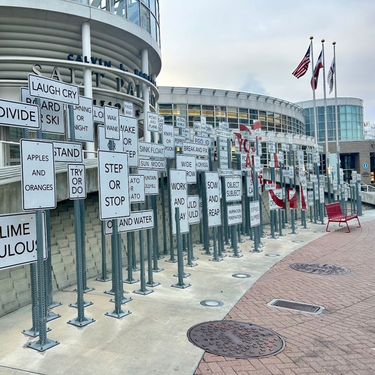 More than 150 road signs surround the bright red map pin, designed to look like an online location marker. It points directly to a sidewalk bench. This permanent art installation called "Point of View" was unveiled in 2016 and continues to be one of the most popular photo-opp spots in Salt Lake City.