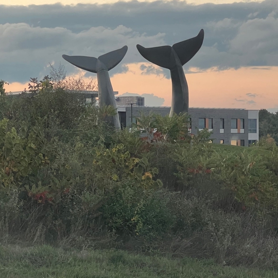 "Reverence" was created by sculptor John Sardonis in 1989. He carved the sculptures from 36 tons of African black granite. Each sculpture was fit together from two separate pieces - the vertical tail and the horizontal fluke. While whales aren't a common sighting in Vermont, remains of what was probably a Beluga were unearthed in 1849 - probably a remnant of the Ice Age when this region was covered by the Champlain Sea.