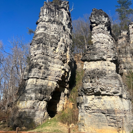 These towering spires are remnants of when the Shenandoah Valley was once covered in a gigantic, deep sea millions of years ago. As the seas receded, the destructive water shaped these layered limestone formations which stand 65 to 120 feet tall. There is a fence that cordons them off forbidding visitors from further destroying the soft stone.