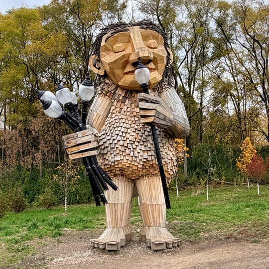 Mama Rosa is a 25-foot-tall troll sculpture crafted by Danish artist Thomas Dambo, situated in Firefly Grove Park in Wauwatosa, Wisconsin. As Dambo's first installation in the state and part of his global series of over 150 trolls, Mama Rosa is constructed from recycled materials, including wood from 50 local trees and repurposed streetlight posts, embodying themes of sustainability and community engagement. The sculpture features Mama Rosa holding a bouquet made from old Wauwatosa streetlight posts, adding a whimsical touch to the park's landscape.
