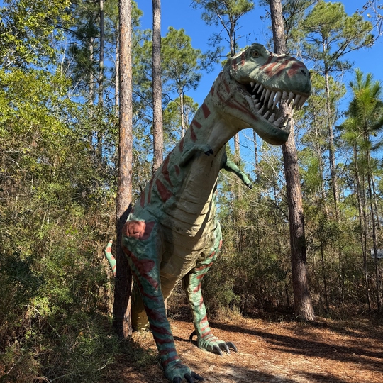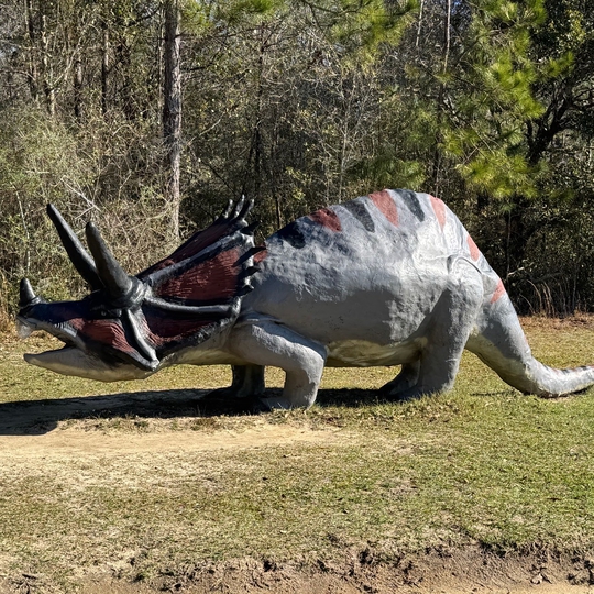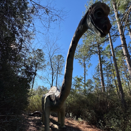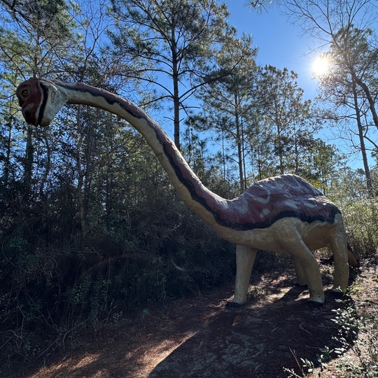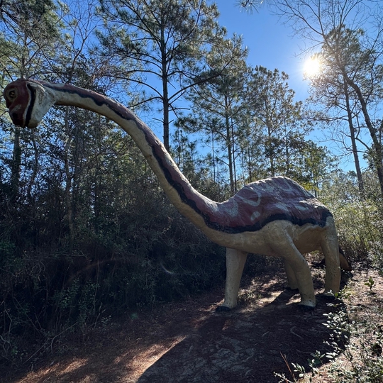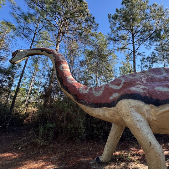 Mark Cline, dinosaur-sculptor extraordinaire, was commissioned in 1991 by billionaire George Barber to create a woodland Jurassic park. Seven beautifully colored giant prehistoric reptiles are hidden in the woods near the side of a road past the clearing. Just like any respectable Jurassic-styled theme park, this one contains hungry mosquitoes so apply the bug spray liberally before you venture through the trees on your adventure.