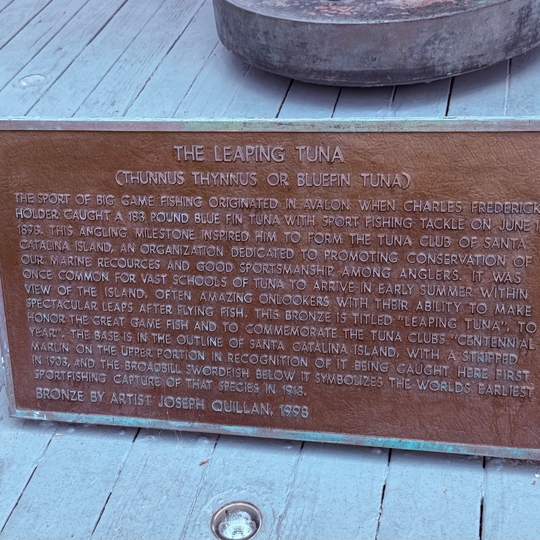 The Leaping Tuna Statue in Avalon, California is a striking bronze sculpture that celebrates the island’s deep roots in big-game sportfishing. Created in 1998 by artist Joseph Quillan, it honors the centennial of the Tuna Club and the legendary bluefin tuna that once filled local waters. Positioned near the waterfront, the dynamic, mid-air fish captures the thrill of the chase and pays tribute to Avalon’s role as the birthplace of modern sportfishing.