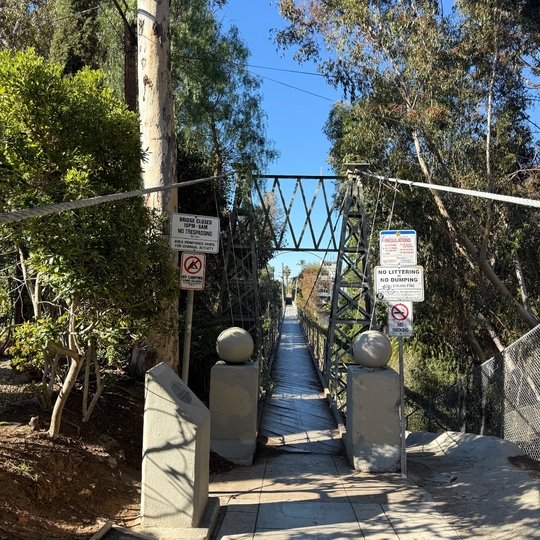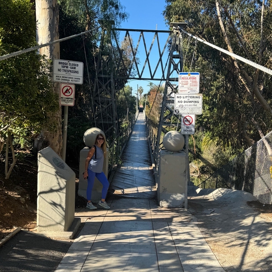 A long, slender footbridge crosses the Sessions Canyon in San Diego. Surrounded by year-round green foliage, this suspended walkway rises 70 feet above the shallow depression. This bridge isn't for those with trepidation of heights - a gusty wind can make it sway side to side.