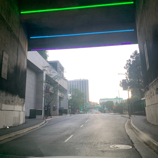 Neon installation artist Tory DiPietro created this 22-foot masterpiece as a message of unity during strange and dark times. Rainbow stripes of light frame the caption "Los Angeles" inside a bright red heart and greet drivers making their way home. While it only illuminates a small corner of the world, DiPietro hopes that "The Light at the End of the Tunnel" can be seen by everyone around the world.