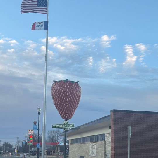The World's Largest Strawberry is a mouthwatering crimson fiberglass sculpture complete with seeds. The 15-foot tall fruit is perched on a platform in front of City Hall in Strawberry Point, IA.