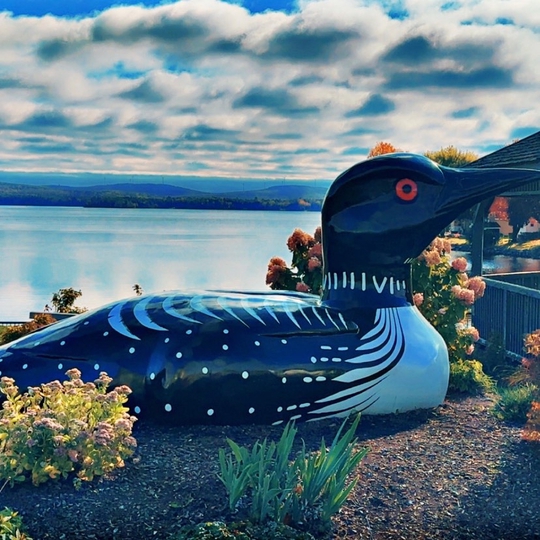 One of the largest decorative loons ever, this six-foot-tall sculpture is painted to a gleam. She is "floating" in a pile of woodchips in a small garden, placed in a picturesque spot next to a gazebo. The gavia loon is normally the size of a large duck and are a common sighting in Maine.