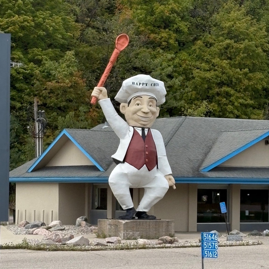 The Happy Chef Restaurant in Mankato, Minnesota is the last survivor of this iconic roadside franchise restaurant. And it's the only place to eat with its own talking spoon Happy Chef statue! (Ironically, the message is sometimes sad according to a few accounts.). At any rate, he's a big, bow-legged chef waving a big spoon at all the motorists passing by on Highway 169 to stop in and have a bite to eat.
