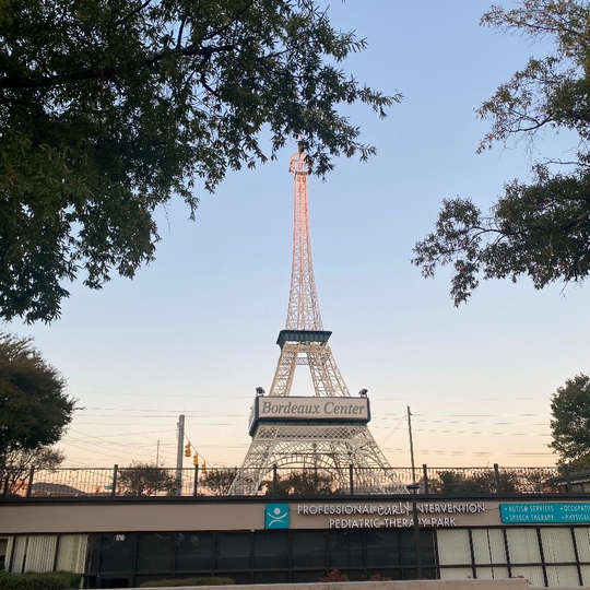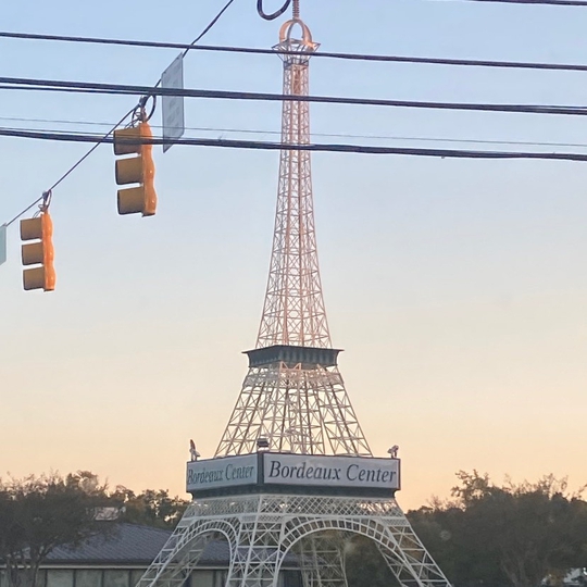 Outside the Bordeaux Center in Fayetteville, North Carolina, stands an approximately 100-foot-tall replica of Paris's iconic Eiffel Tower. Installed in 1971, a few years after the shopping plaza was first established in 1964, the tower lends a certain “je ne sais quoi,” or distinctive character, to the shopping plaza named for the French city known as the world’s wine capital. The tower is occasionally illuminated to mark special occasions, such as being lit in red, white, and blue for Independence Day. This distinctive structure highlights Fayetteville's unique blend of local culture and international flair.