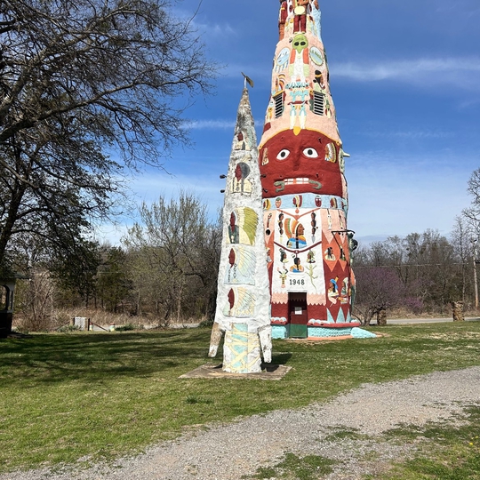 Ed Galloway was a true artist, self-taught but passionate. He created tall, magnificent totem poles from scratch, a sandstone and metal skeleton covered in concrete and painted by hand. His masterpiece, simply titled the Totem Pole, is the world's largest made of concrete at 60 feet tall and 30 feet in diameter. Also on the grounds is the Fiddle House containing Galloway's other works of art and his fiddle collection. His legacy almost fell to ruins but the Rogers County Historical Society stepped in and restored his fanciful creations.