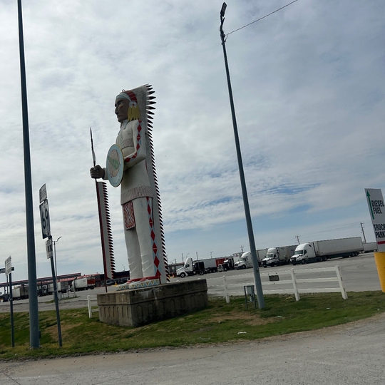 Dressed in his best ceremonial garb, this 50-foot tall Indian Chief has straight-as-a-ruler posture and a grim, determined look on his face. Although he appears to be heading off to a big event - either war or a grand ceremony - he is merely greeting visitors to a smoke shop. (Photo by Traveling Lower48)