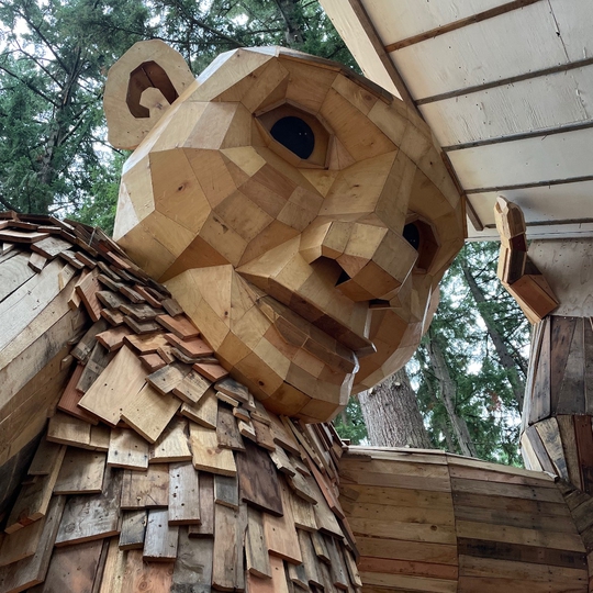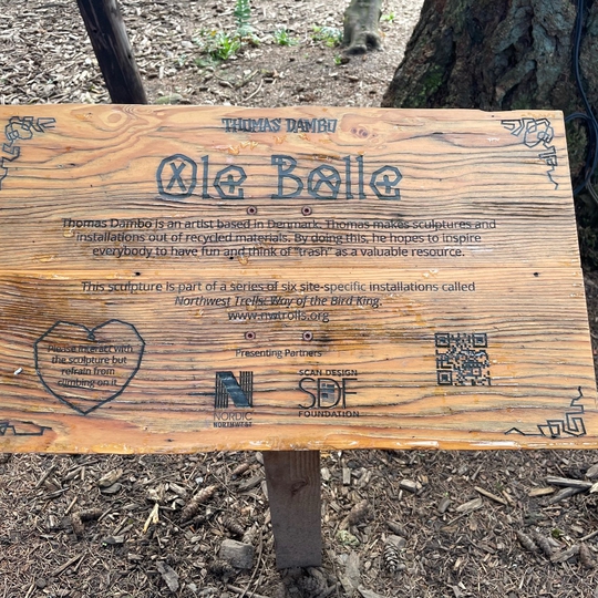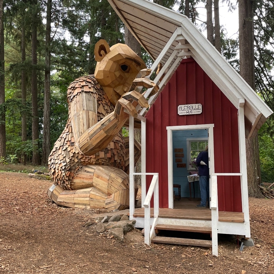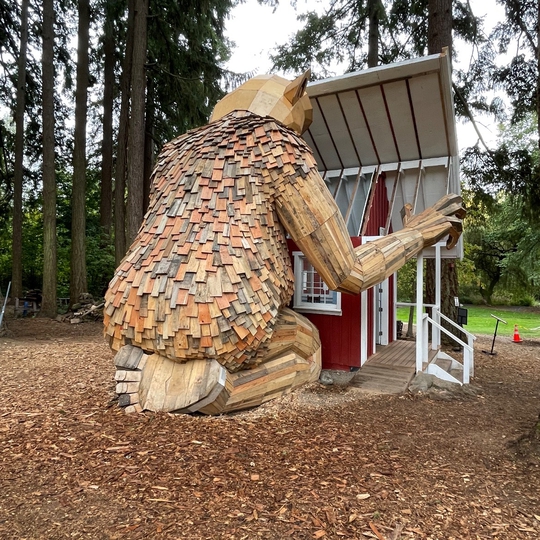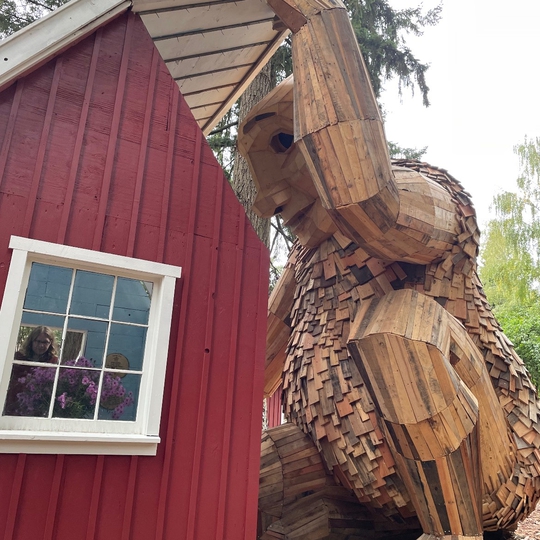 The Ole Bolle Troll in Portland is a whimsical, larger-than-life wooden sculpture by Danish environmental artist Thomas Dambo, standing about 19 feet tall and crafted entirely from recycled materials as part of his Northwest Trolls: Way of the Bird King public art project. t’s installed on the grounds of Nordic Northwest in Southwest Portland where the troll appears to be peering into a tiny red house, inviting visitors to engage with the story and surroundings. Ole Bolle blends folklore, sustainability, and community creativity, encouraging people to explore nature and rethink waste in playful, imaginative ways.