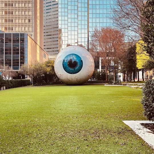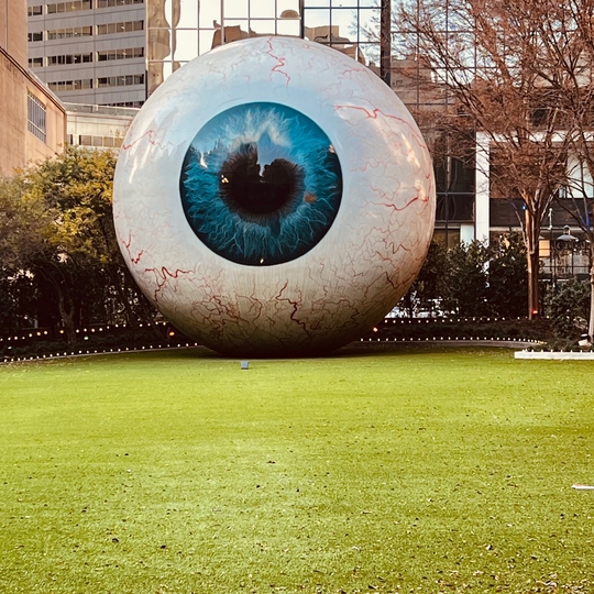 The 30-ft. tall ocular blue orb is a bit disturbing, and it is enclosed inside a black gate. But if you can enter the hotel across the street, you might be able to snap a photo clear of obstructions.