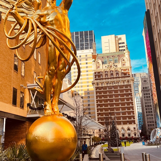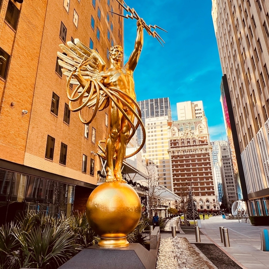 The statue originally named "Genius of Telegraphy" by Evelyn Beatrice Longman is formally known as the "Spirit of Communication." Since its completion in 1916, this statue has served as the symbol for AT&T (and its former entity, Western Electric). Over time, it has also been informally referred to as the "Golden Boy" statue and previously known as the "Genius of Electricity."