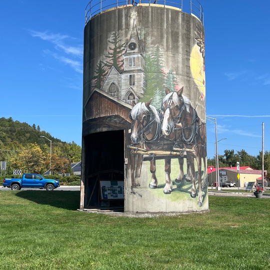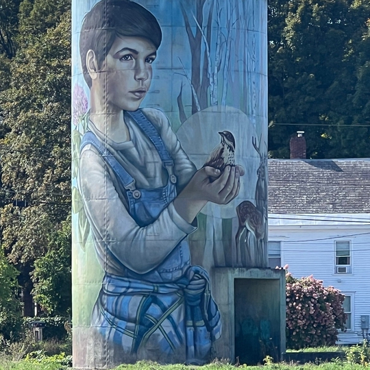 The Jeffersonville silo murals, painted in 2016 by artist Sarah C. Rutherford, transform two former Bell Gates Lumber silos into a sweeping visual narrative of the town’s past, present, and future. The north silo features an elderly farmer’s face and seasonal imagery, while the south silo depicts a child alongside elements like a barred owl and gazebo, symbolizing continuity, growth, and community pride.